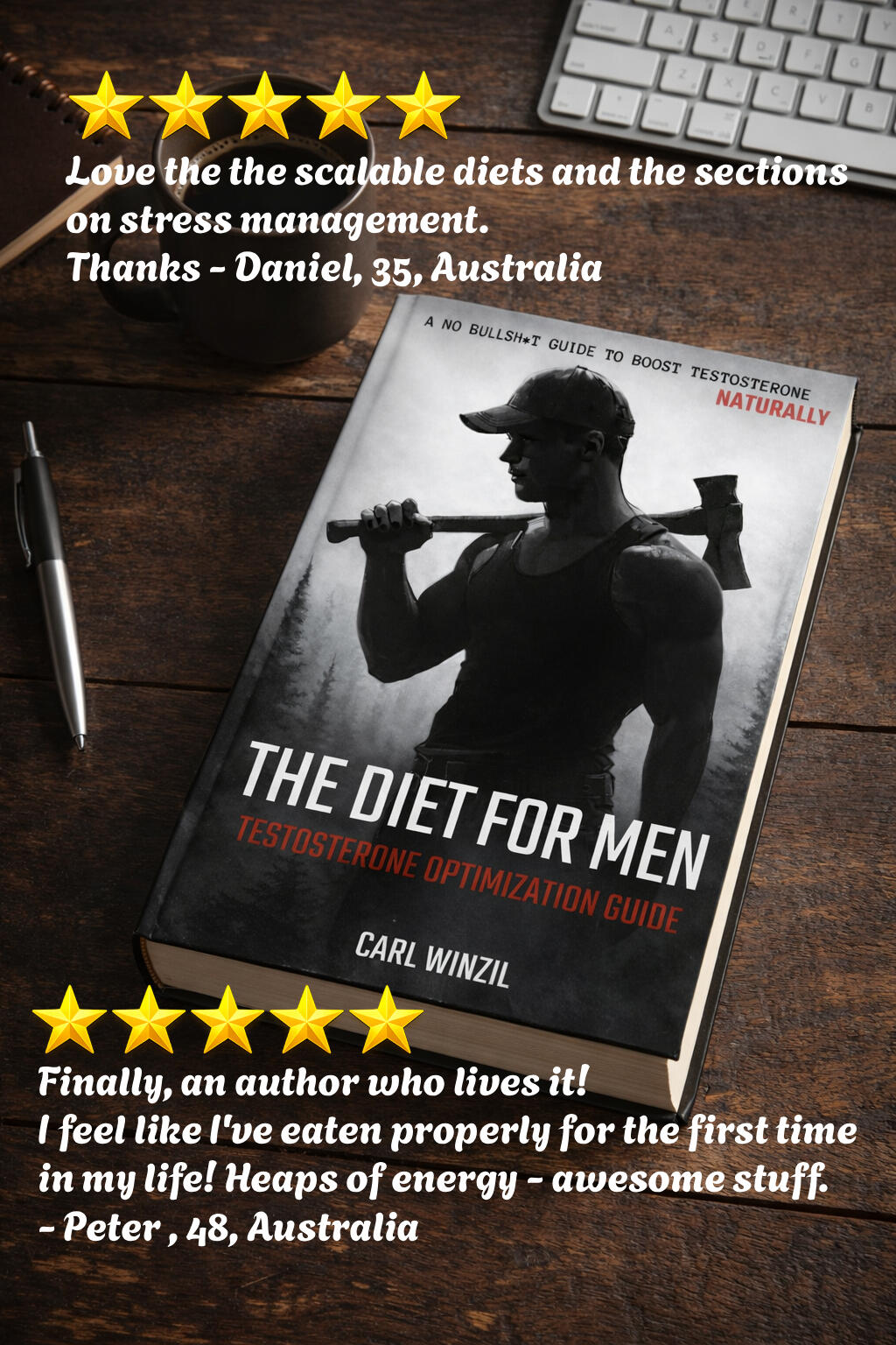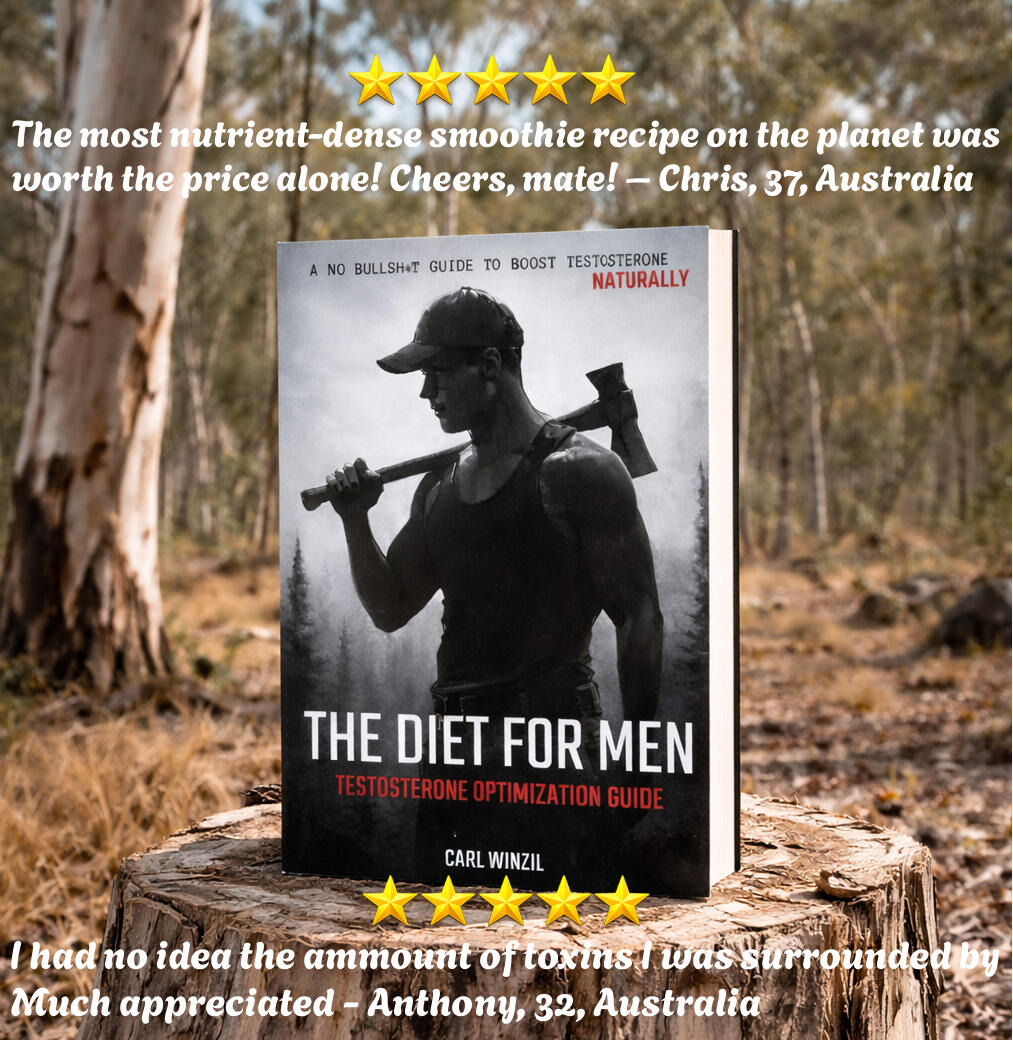 G’day! - I’m Carl, author of The Diet for Men.I built my testosterone to 900+ ng/dL naturally and kept it there using the exact methods in this guide.I’ve spent over 15 years studying nutrition, physiology, and human performance, and applying it in the real world as a 45-year-old Australian woodchopper with a high-output exercise lifestyle.My lifestyle demands strength, endurance, and recovery. Most diets don’t hold up under that.